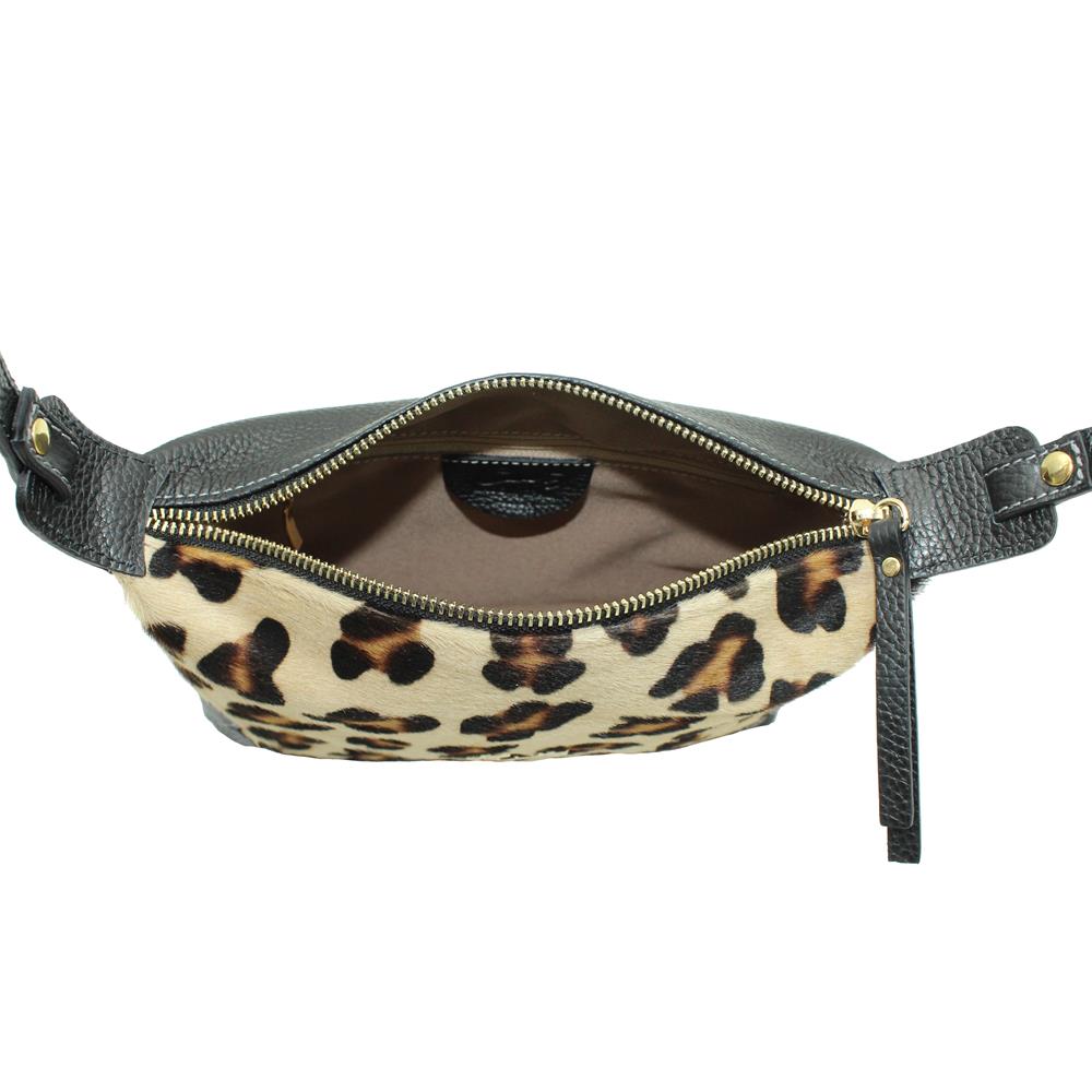 Bolso bandolera con la delantera en leopardo. Cierre de cremallera.